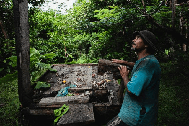 “Ouvi o barulho do tiro e logo em seguida o som das labaredas. Eu quis correr pra ver o que tava acontecendo, mas ela não deixou”, lembra o agricultor, apontando para a esposa. “Ela disse que iam me matar se eu saísse de casa.” O casal permaneceu desperto durante toda a madrugada, escutando o barulho das chamas consumindo seu principal meio de subsistência, construído ao longo de anos de trabalho na terra.