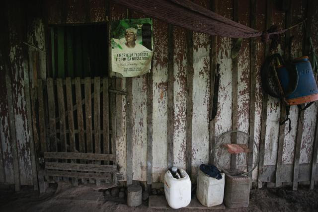 Entrada da casa de Lindoval com pôster de Dorothy Stang pendurado
