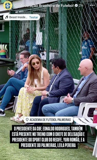 Registro do bate-papo descontraído entre o presidente da CBF, Ednaldo Rodrigues, a presidente do Palmeiras, Leila Pereira, e o chefe da delegação da Seleção Brasileira, Yuri Romão, presidente do Sport-PE. Nem precisava legendar a foto, que evidencia a forte influência do Palmeiras dentro da entidade que comanda o futebol brasileiro.