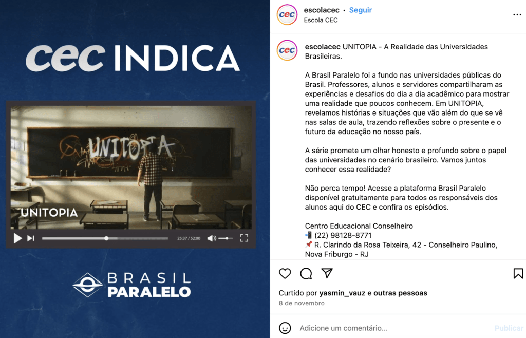 A CEC segue parceira da Brasil Paralelo. A escola não respondeu aos questionamentos enviados pelo Intercept. Instituto Recebs e Brasil Paralelo também ignoraram nossos e-mails.