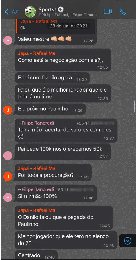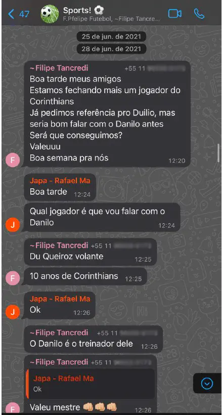Transcrição literal (28/6/2021) 12:20 — Filipe Tancredi: “Boa tarde meus amigos / Estamos fechando mais um jogador do Corinthians / Já pedimos referência pro Duilio, mas seria bom falar com o Danilo antes / Será que conseguimos? / Valeuuu / Boa semana pra nós” 12:24 — Japa – Rafael Ma: “Boa tarde” 12:24 — Japa – Rafael Ma: “Qual jogador é que vou falar com o Danilo” 12:25 — Filipe Tancredi: “Du Queiroz volante” 12:25 — Filipe Tancredi: “10 anos de Corinthians” 12:26 — Japa – Rafael Ma: “Ok” 12:26 — Filipe Tancredi: “O Danilo é o treinador dele” 12:26 — Japa – Rafael Ma: “Ok” 12:26 — Filipe Tancredi: “Valeu mestre 👊👊👊” 12:35 — Japa – Rafael Ma: “Como está a negociação com ele?” 12:35 — Filipe Tancredi: “Falei com Danilo agora.” 12:35 — Filipe Tancredi: “Falou que é o melhor jogador que ele tem lá no time.” 12:36 — Filipe Tancredi: “É o próximo Paulinho.” 12:37 — Filipe Tancredi: “Tá na mão, acertando valores com eles só.” 12:37 — Filipe Tancredi: “Pai pede 100k nos oferecemos 50k” [sic] 12:45 — Japa – Rafael Ma: “Por toda a procuração?” 12:46 — Filipe Tancredi: “Sim irmão 100%.” 12:46 — Japa – Rafael Ma: “O Danilo falou que é pegada do Paulinho.” 12:46 — Japa – Rafael Ma: “Melhor jogador que ele tem no elenco do 23.” Notas de edição: número de telefone suprimido por privacidade; a transcrição preserva ortografia e pontuação das mensagens originais.