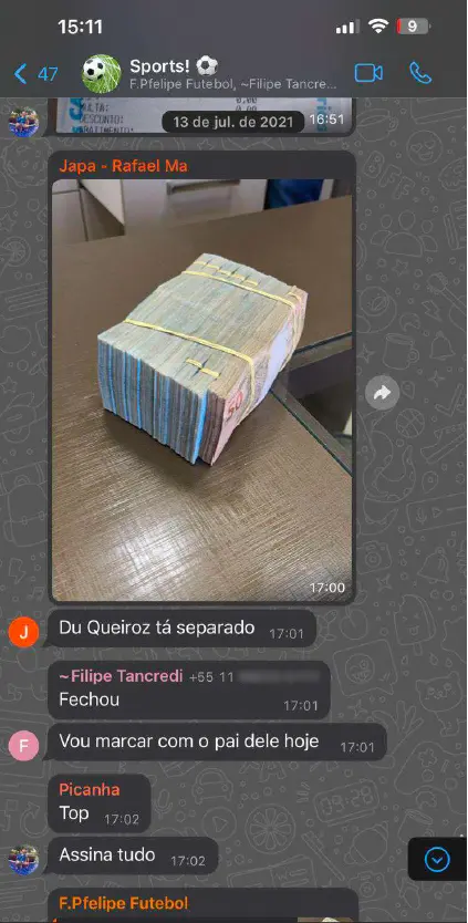 13 de jul. de 2021 17:00 — Japa – Rafael Ma: [Foto] (maço de cédulas sobre uma mesa) 17:01 — Japa – Rafael Ma: “Du Queiroz tá separado” 17:01 — Filipe Tancredi: “Fechou” 17:01 — F: “Vou marcar com o pai dele hoje” 17:02 — Picanha: “Top” 17:02 — (remetente não identificado): “Assina tudo”