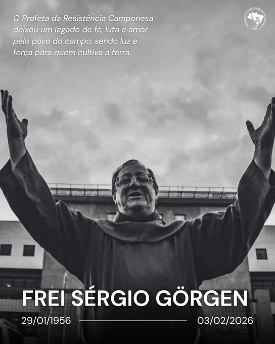 “Nos despedimos de Frei Sérgio Antônio Görgen, frade franciscano e referência da luta pela terra e pela justiça social. Fé encarnada no povo, companheiro do MST, deixou um legado de coragem, coerência e compromisso com a Reforma Agrária”.