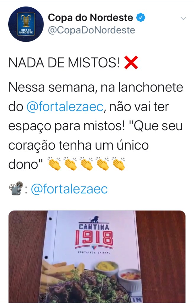 Até o perfil da Copa do Nordeste propagou mensagem contra os nordestinos que torcem por times que não são da região. Uma tolice, pulverizada pela virada do Flamengo sobre o Fortaleza (2 a 1), com o aval de 15 mil rubro-negros presentes ao Castelão. Acredito que seria melhor para o futebol se as pessoas sempre torcessem pelos times de suas regiões, de suas cidades. Em tese, assim eles seriam mais fortes. Mas ninguém controla q paixão alheia.